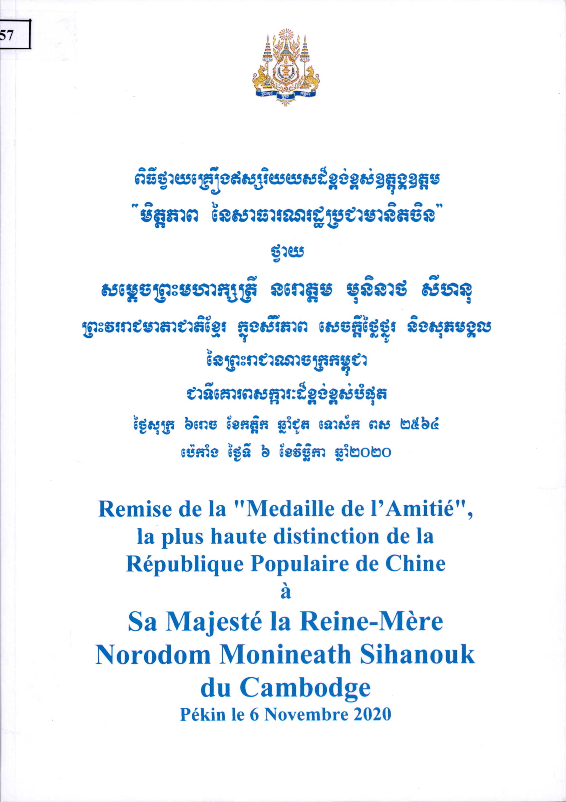 ពិធីថ្វាយគ្រឿងឥស្សរិយយសដ៏ខ្ពង់ខ្ពស់ឧត្តុង្គឧត្តម (មិត្តភាពនៃសាធារណរដ្ឋប្រជាមានិតចិន)​ ថ្វាយសម្តេចព្រះមហាក្សត្រី នរោត្តមុនិនាថ សីហនុ ព្រះវររាជមាតាជាតិខ្មែរ ក្នុងសេរីភាព សេចក្តីថ្លៃថ្នូរ និងសុភមង្គល។ ប៉េកាំង ថ្ងៃទី៦ ខែវិច្ឆិកា ឆ្នាំ២០២០។ Remise de la “Medaille de l’Amitie”, la plus haute distinction de la Republique Popotaire de Chine a Sa Majeste la reine-Mere Norodom Monineath Sihanouk du Cambodge (Pekin le 6 November 2020) ​