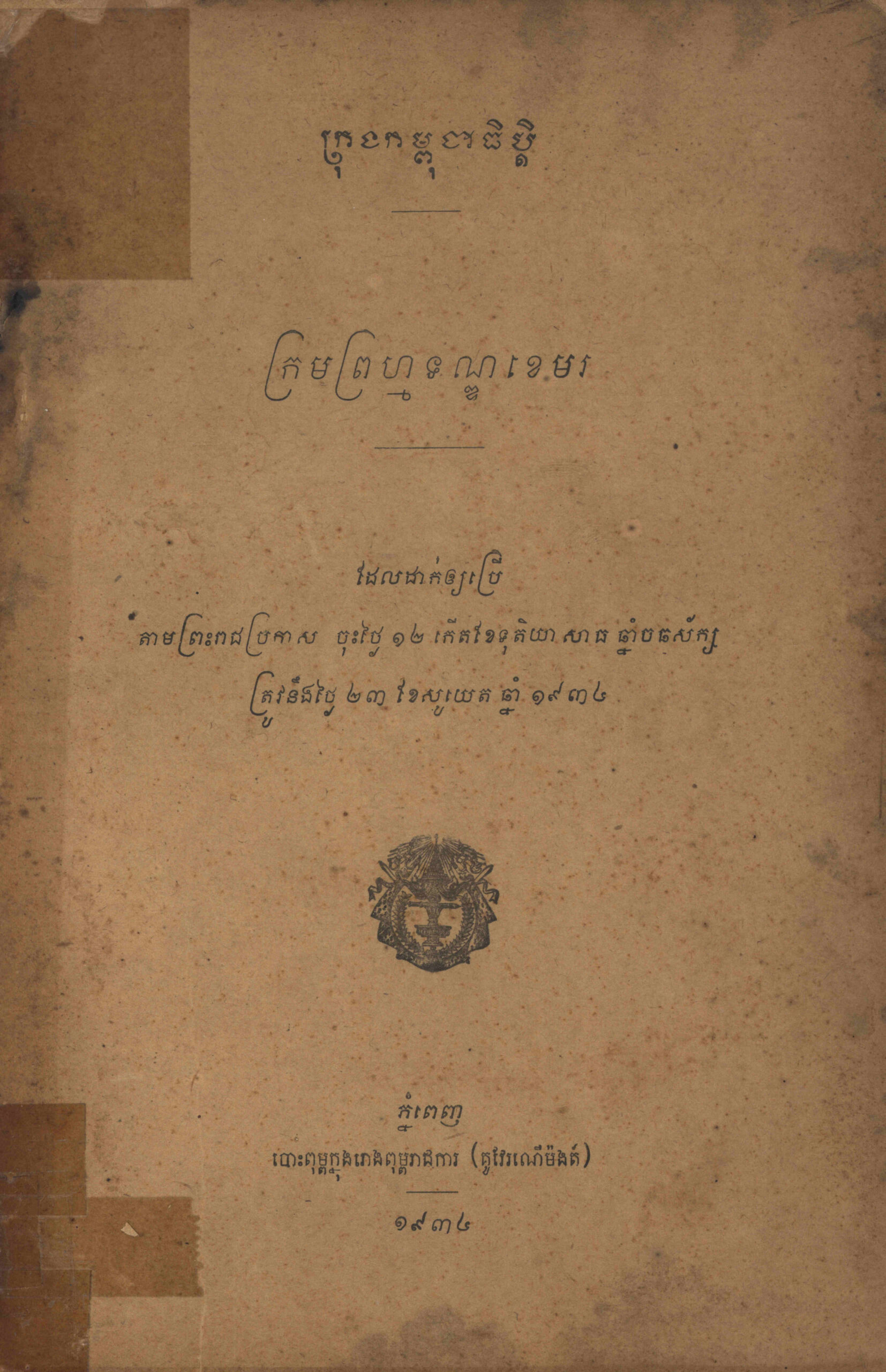 ក្រមព្រហ្មទណ្ឌខេមរៈ ដែលដាក់ឲ្យប្រើតាមព្រះរាជប្រកាស ចុះថ្ងៃ១២ កើត ខែទុតិយាសាធ ឆ្នាំច ឆស័ក្ស ត្រូវនឹងថ្ងៃ២៣ ខែសូយេត ឆ្នាំ១៩៣៤.