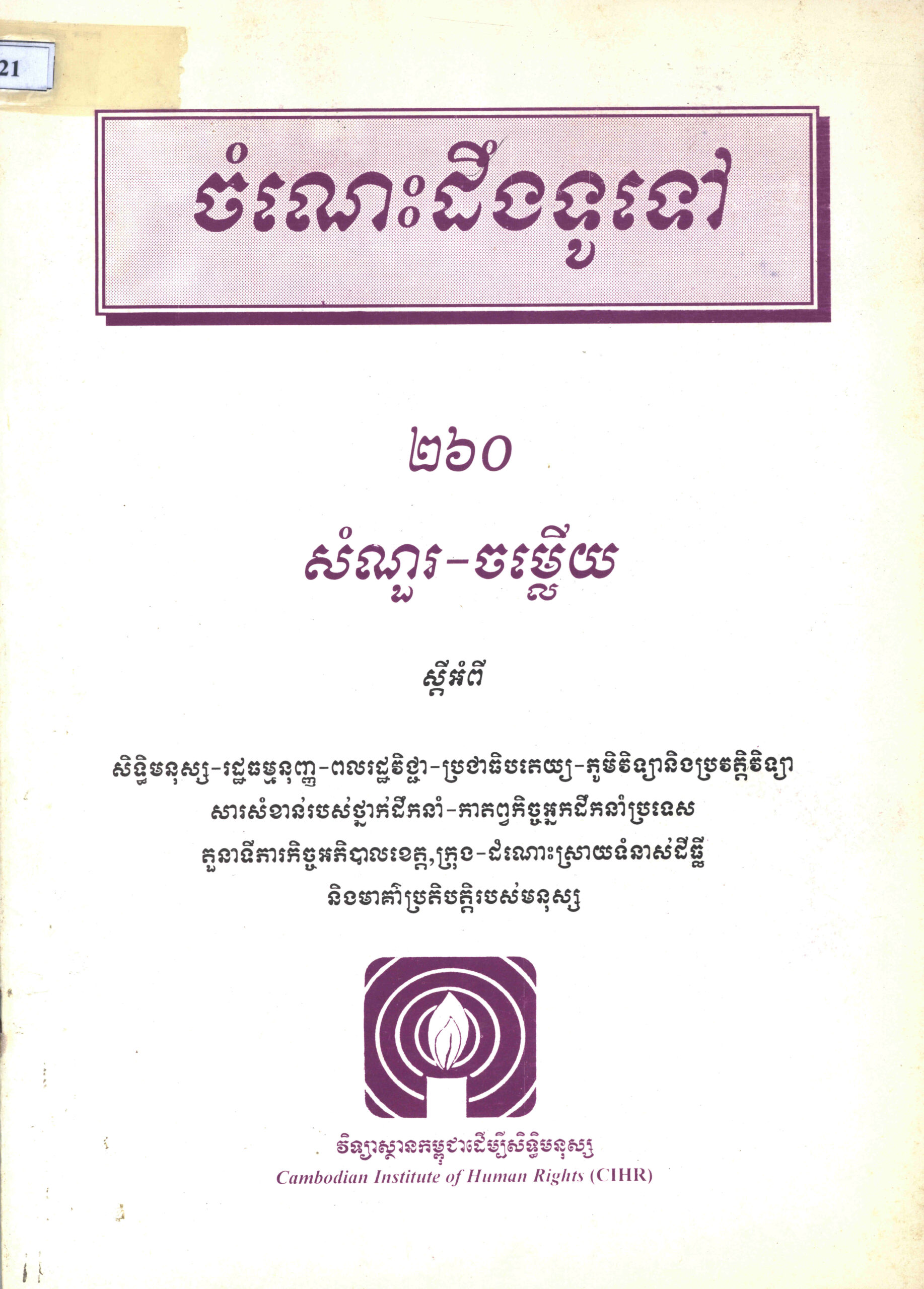 ចំណេះដឹងទូទៅៈ ២៦០ សំនួរ-ចម្លើយ ស្តីអីពីសិទ្ធិមនុស្ស-រដ្ឋធម្មនុញ្ញ-ពលរដ្ឋវិជ្ជា-ប្រជាធិបតេយ្យ-ភូមិវិទ្យា និងប្រវត្តិវិទ្យា សារសំខាន់របស់ថ្នាក់ដឹកនាំ-កាតព្វកិច្ចអ្នកដឹកនាំប្រទេស តួនាទីភារកិច្ចអភិបាលខេត្តក្រុង ដំណោះស្រាយទំនាស់ដីធ្លី និងមាគ៌ាប្រតិបត្តិរបស់មនុស្ស
