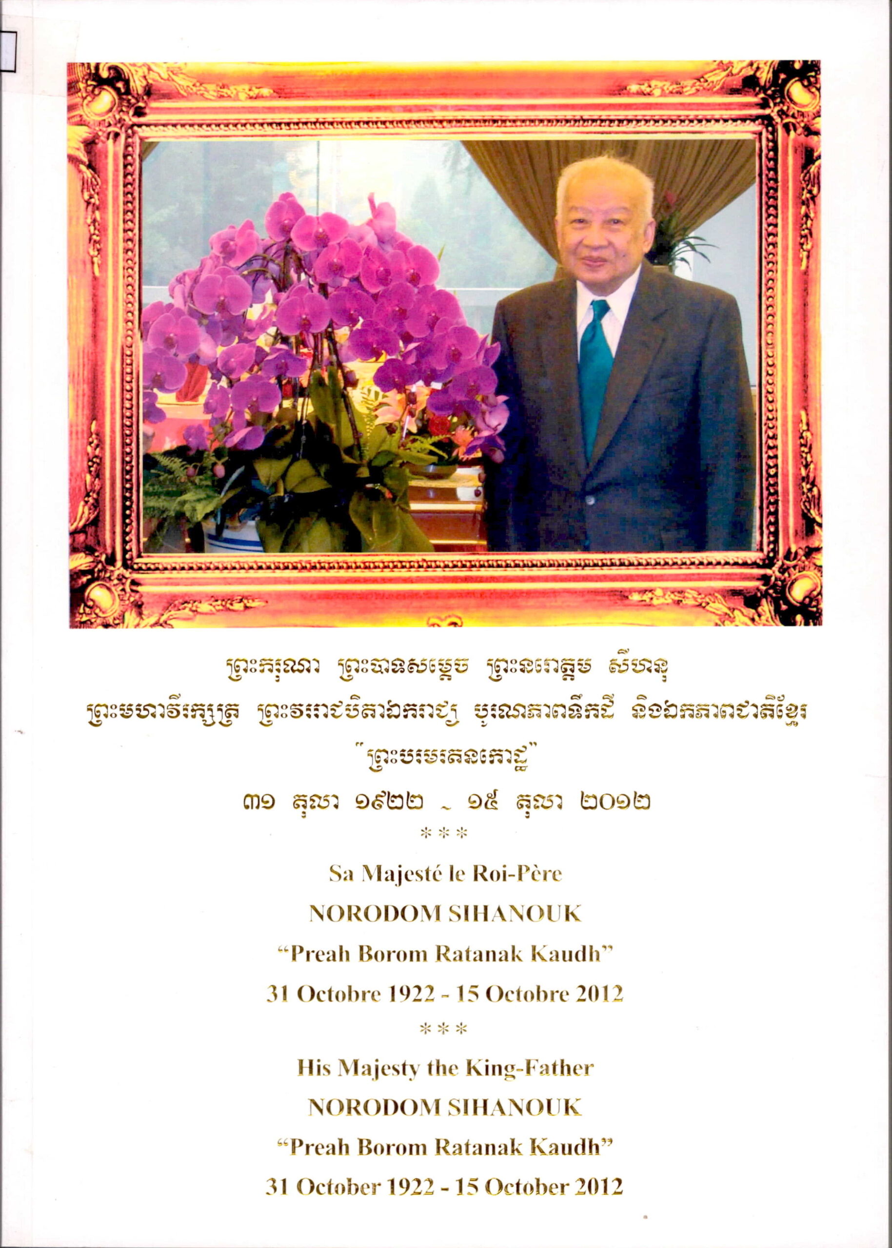 ព្រះករុណា ​ព្រះបាទសម្តេច​ ព្រះនរោត្តមសីហនុ ព្រះមហាវរក្សត្រ ព្រះវររាជបិតាឯករាជ្យ បូរណភាពទឹកដី និងឯកភាពជាតិខែ្មរ​ “ព្រះបរមរតនកោដ្ឋ” ៣១ តុលា ១៩២២ – ១៥ តុលា ២០១២ His Majesty the King-Father NORODOM SIHANOUK “Preah Borom Ratanak Kaudh” 31 October 1922 – 15 Oct