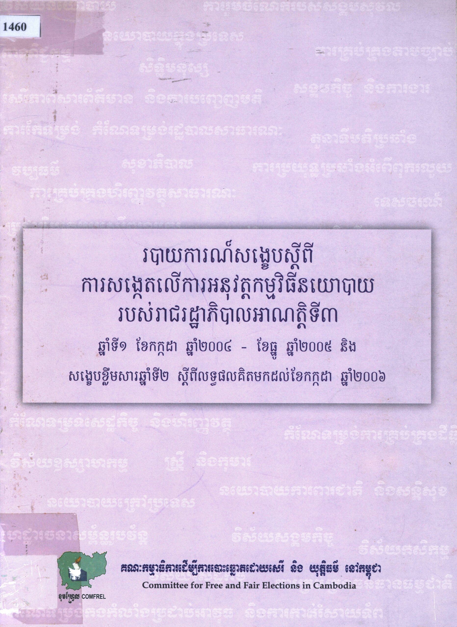 របាយការណ៍សង្ខេបស្តីពីការសង្កេតលើការអនុវត្តកម្មវិធីនយោបាយរបស់រាជរដ្ឋាភិបាលអាណត្តិទី៣: ឆ្នាំទី១ ខែកក្កដា ឆ្នាំ២០០៤ – ខែធ្នូ ឆ្នាំ២០០៥និងសង្ខេបខ្លឹមសារឆ្នាំទី២ ស្តីពីលទ្ធផលគិតមកដល់ខែកក្កដា ឆ្នាំ២០០៦