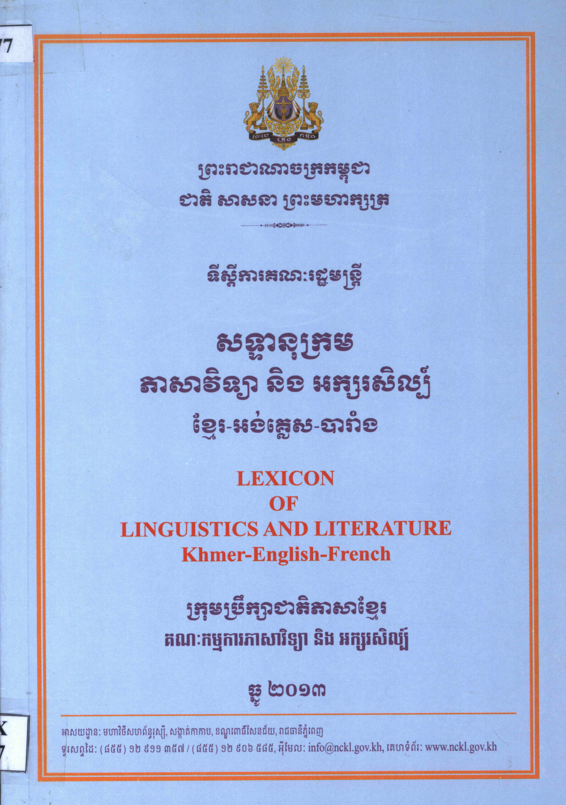 សន្ទានុក្រម ភាសាវិទ្យា និងអក្សរសិល្ប៍ ខ្មែរ-បារាំង-អង់គ្លេស (Lexicon of Linguistics and Literature Khmer-French-English).