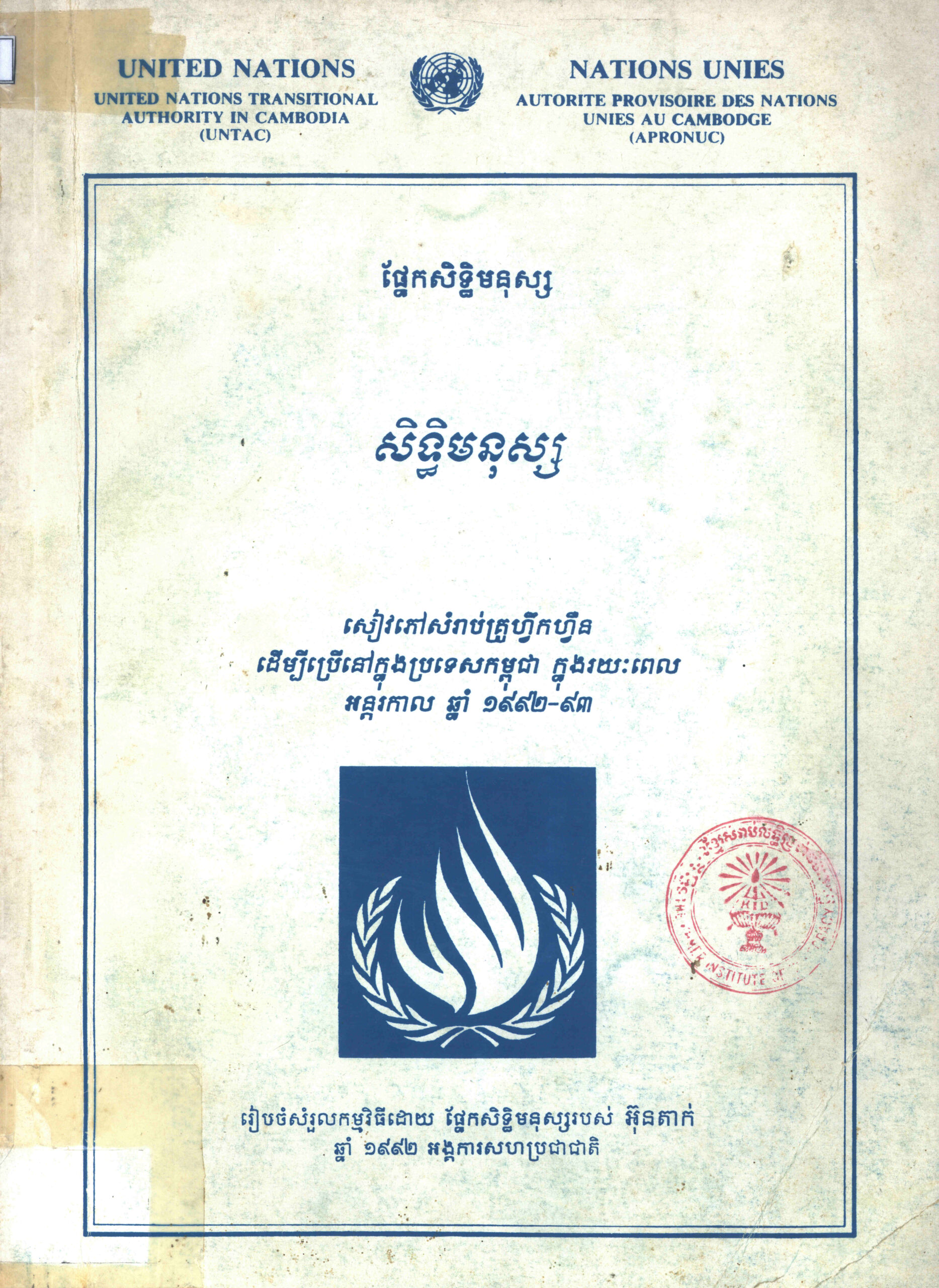 សិទ្ធិមនុស្សៈ ផ្នែកសិទ្ធិមនុស្សៈ សៀវភៅសម្រាប់គ្រូហ្វឹកហ្វឺនដើម្បីប្រើនៅក្នុងប្រទេសកម្ពុជា ក្នុងរយៈពេលអន្តរកាល ឆ្នាំ១៩៩២-១៩៩៣​ កម្រិត គ