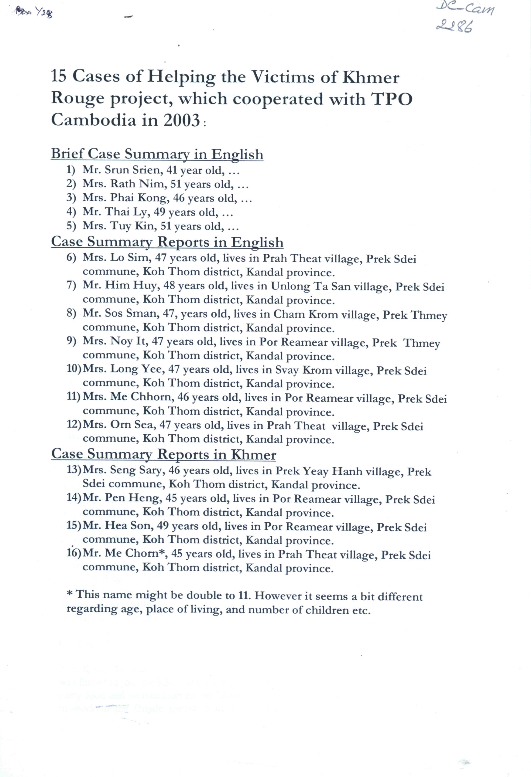 15 Cases of Helping the Victims of Khmer Rouge project, which cooperated with TPO Cambodia in 2003.