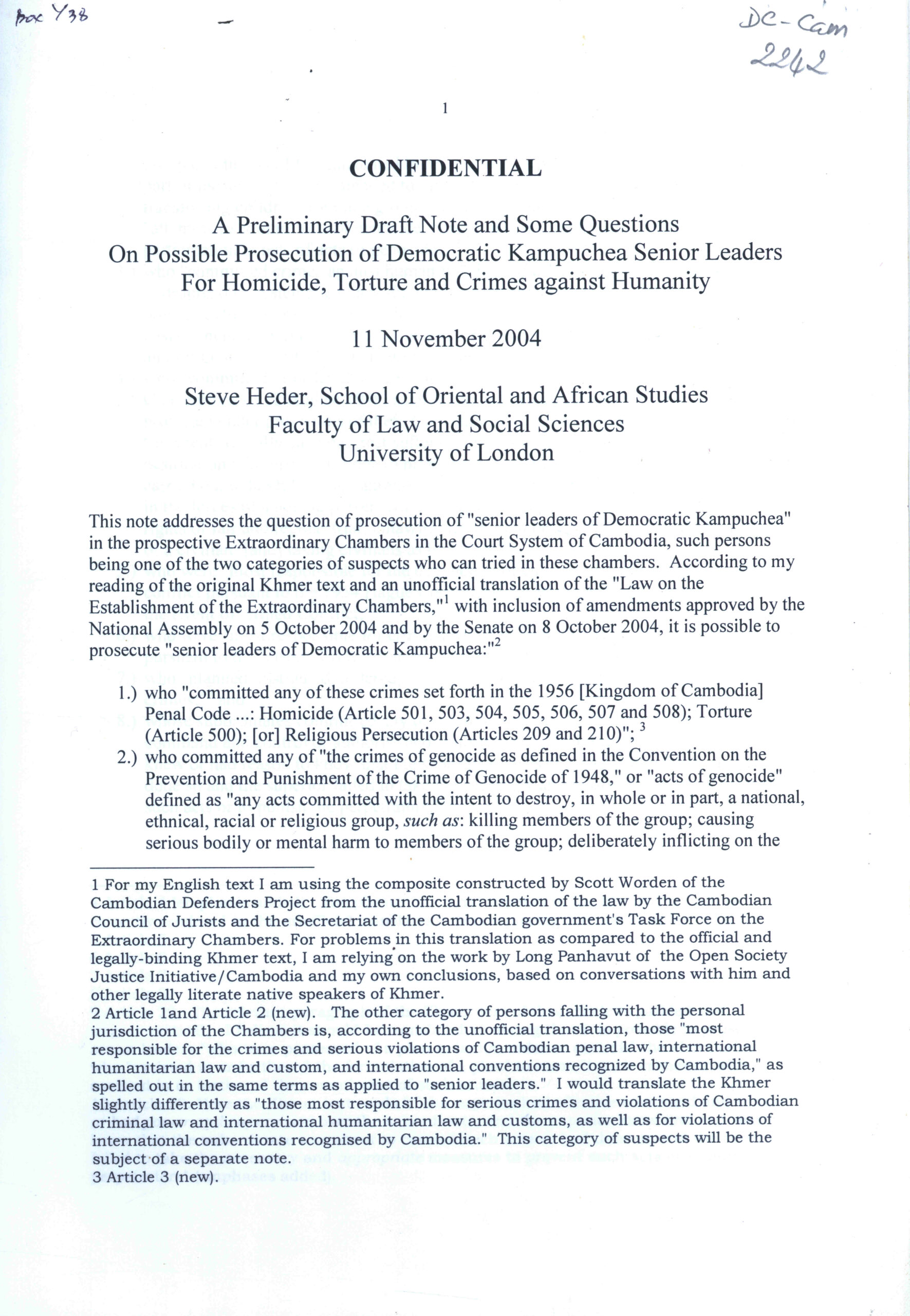 A Preliminary Draft Note and Some Questons on Possible Prosecution of Democratic Kampuchea Senior Leaders for Homicide, Torture and Crimes against Humanity.