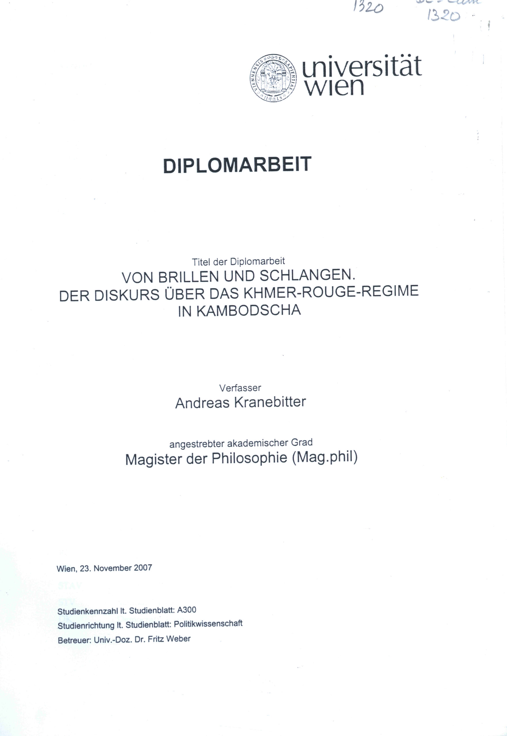 Diplomarbeit: Van Brillen und schlangen Der dislurs uber das Khmer rouge regime in Kambodscha.