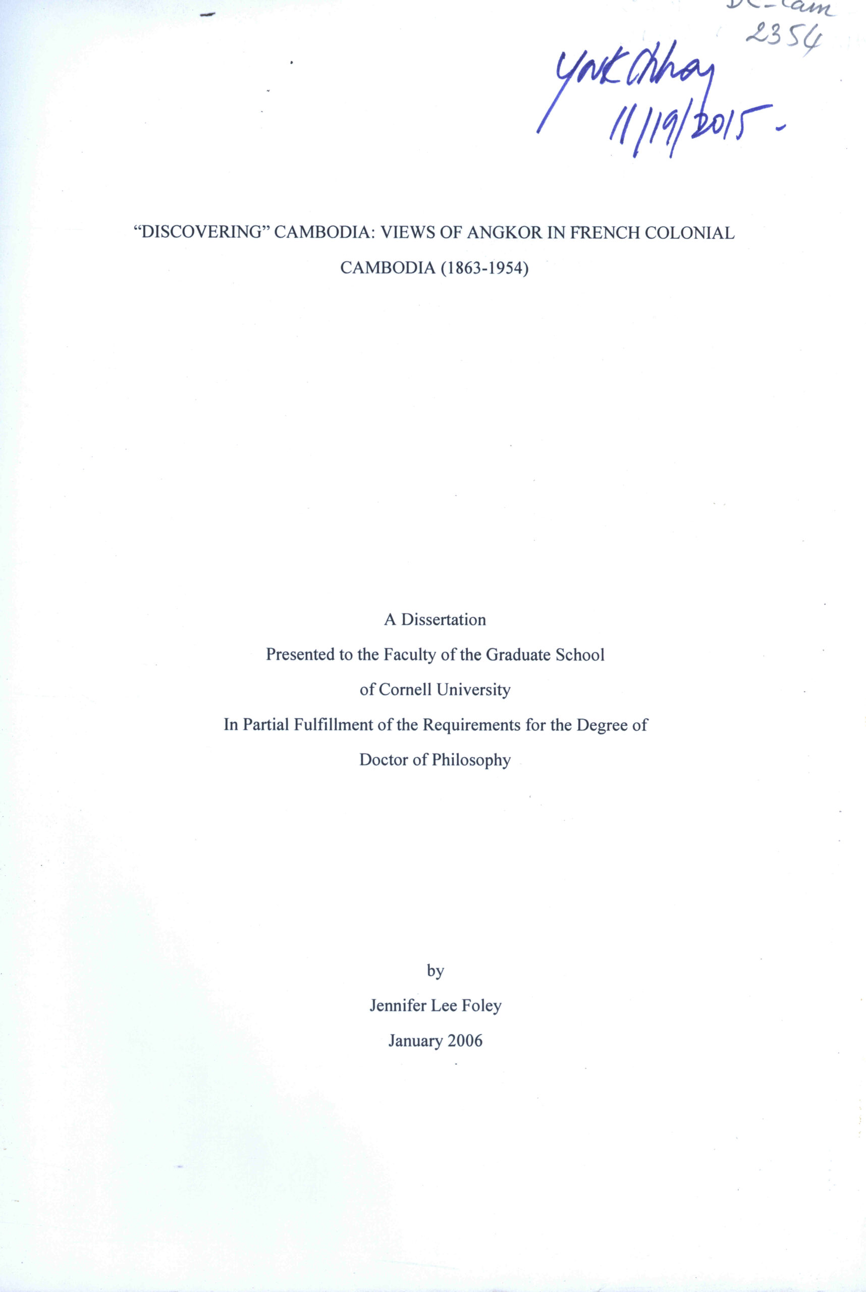 “Discovering” Cambodia: Views of Angor in French Colonial: Cambodia (1863-1954): A Dissertation Presented to the Faculty of the Graduate School of Cornell University.