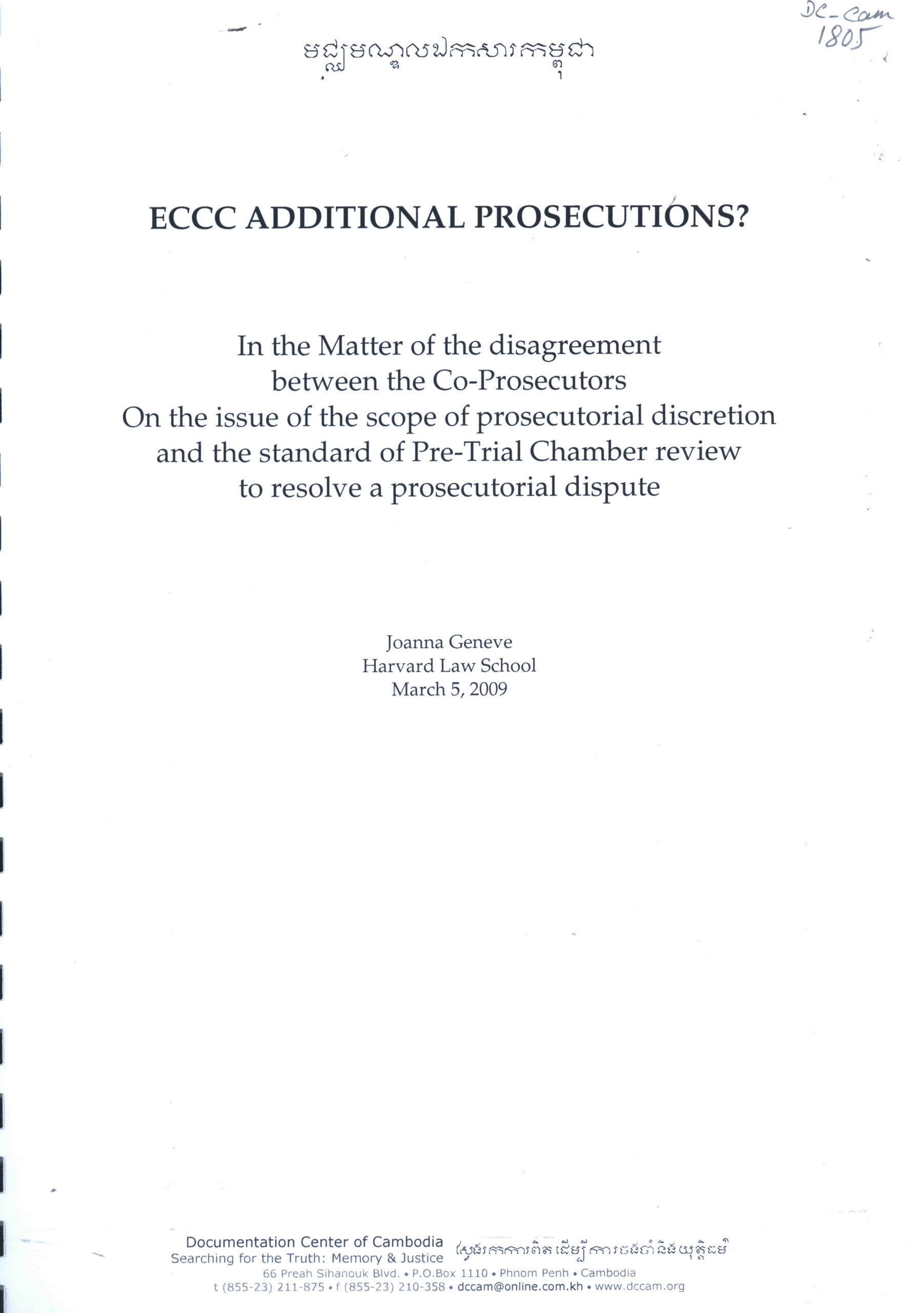 ECCC ADDITIONAL PROSECUTIONS?: In the Matter of the disagreement between the Co-Prosecutors on the issue of prosecutorial discretion and the standard of Pre-Trial Chember review to resolve a prosecutorial discretion and the Standard of Pre-Trial Chamber…