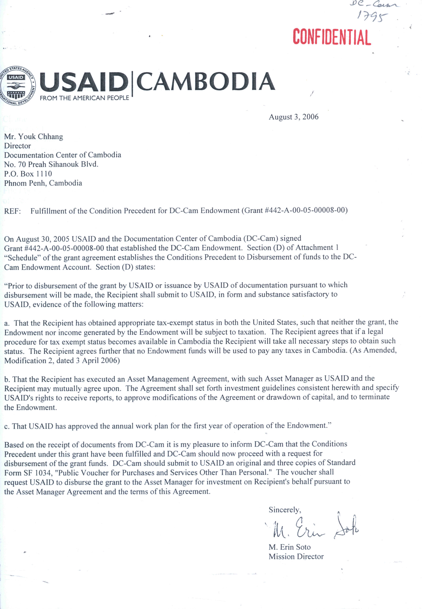 [Fulfillment of the Condition Precedent for DC-Cam Endowment (Grant #442-A-00-05-00008-00).