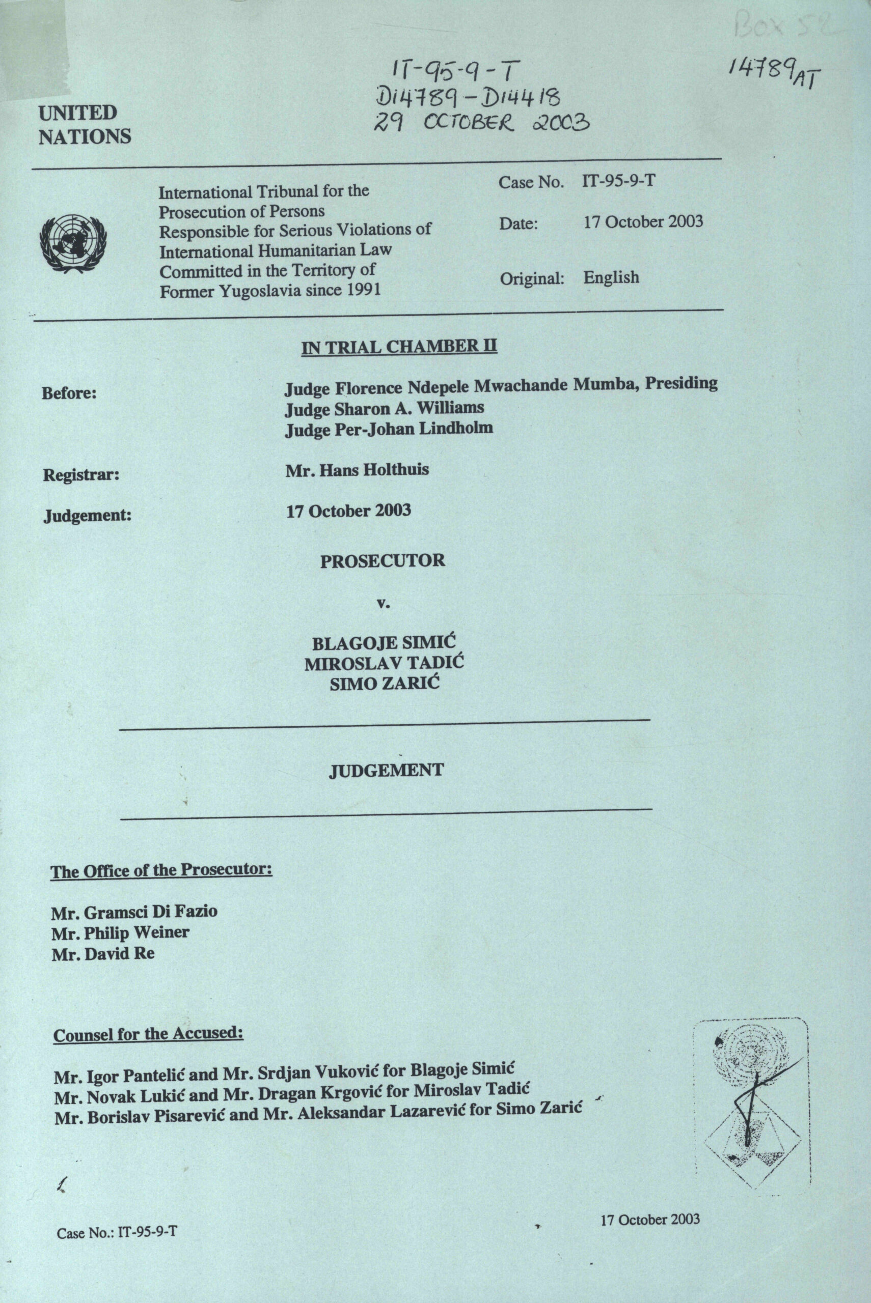 In Trial Chamber II: Prosecutor V. Blagoje – Simic Muroslav Tadic – Simo Zaric.