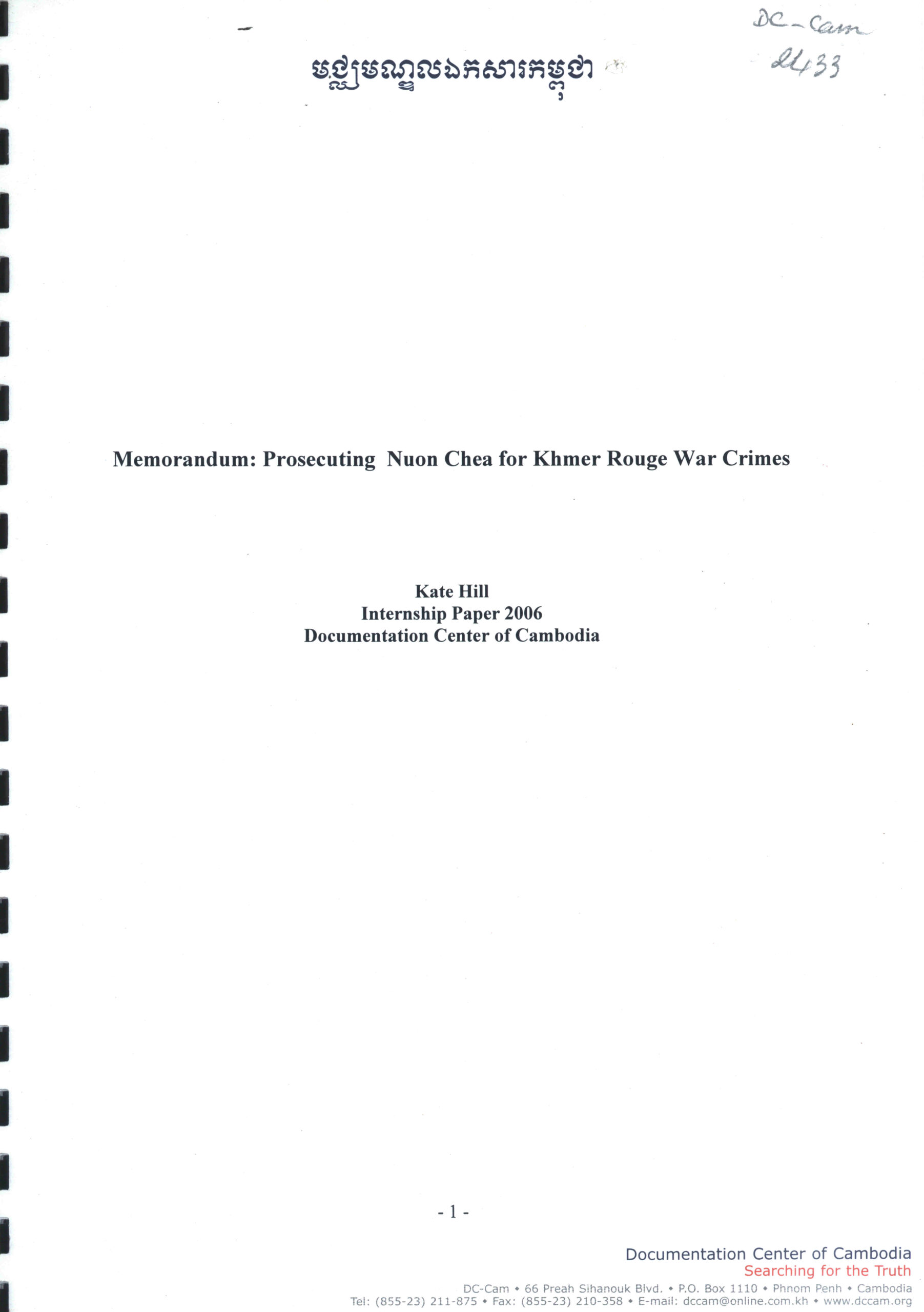 Memorandum: Prosecuting Nuon Chea for Khmer Rouge War Crimes. Internship Paper 2006