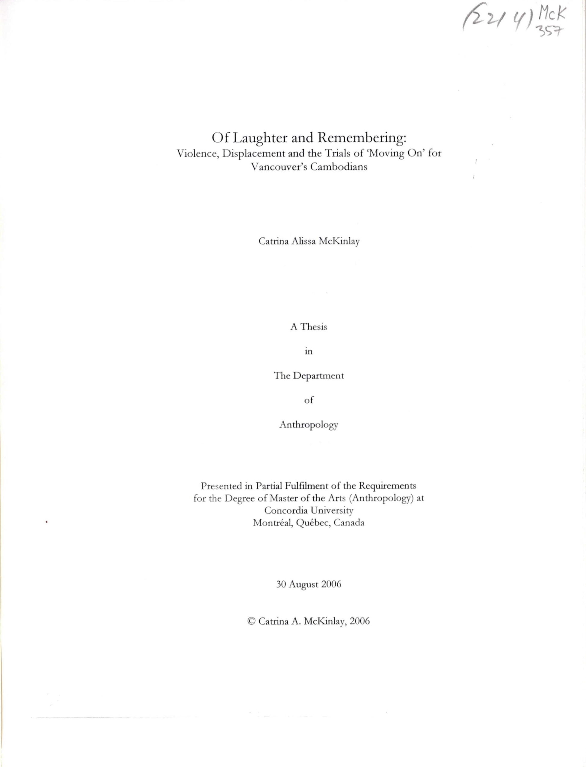 OF LAUGHTER AND REMEMBERING: VIOLANCE, DISPLACEMENT AND THE TRAILS OF MOVING ON FOR VANCOUVER’S CAMBODIANS