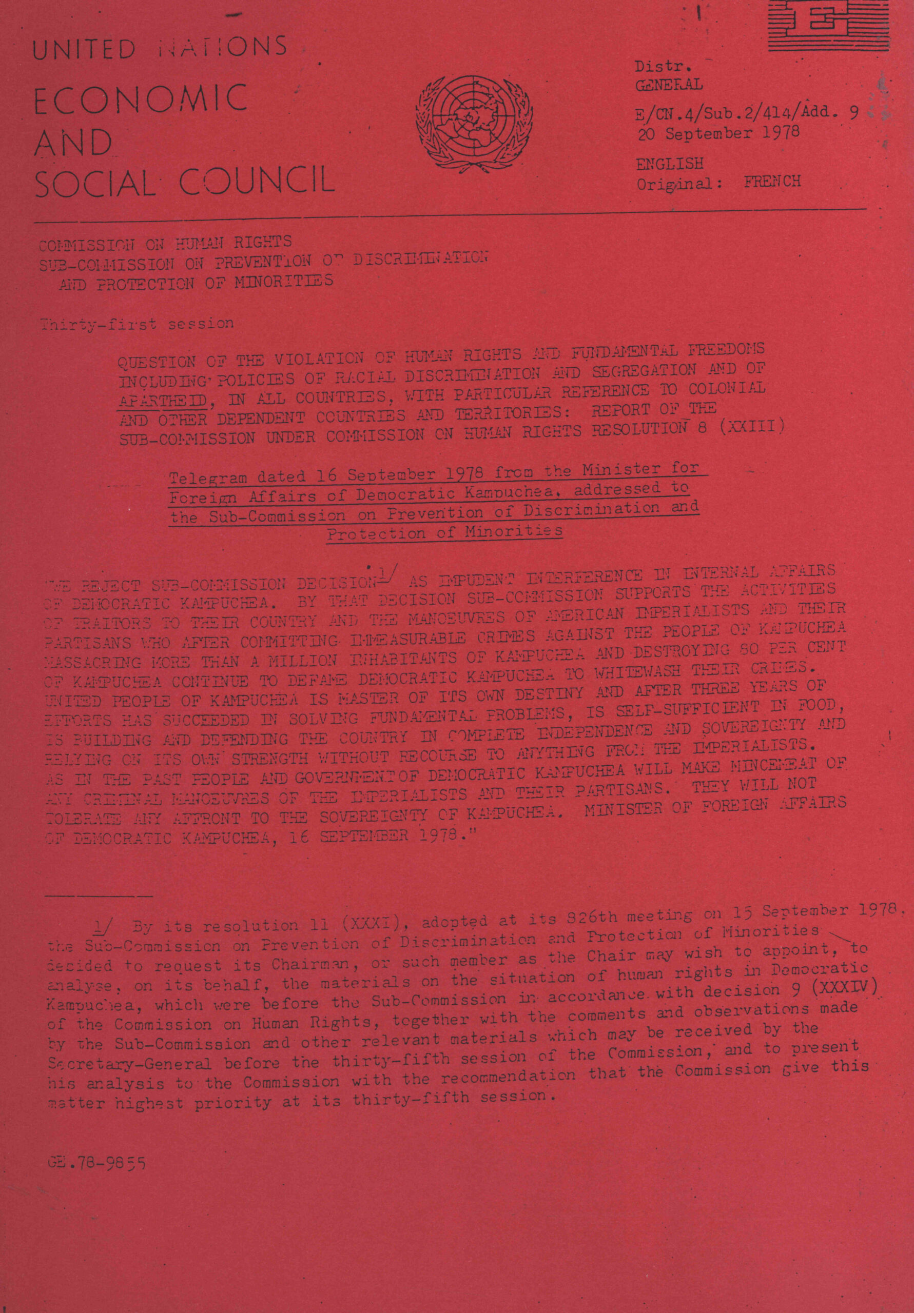 Question of the Violation of Human Rights and Fundamental Freedoms Including Policies of Racial discrimination and Segregation and of Apartjeid, in all Countries, with particular reference to colonial and other dependent coutries and territories: Report of the Sub-Commision under commision on Human Rights Resolution 8 (XXIII) (UN Document): Telegram dated 16 September 1978 from the Minister for Foreign Affairs of Democratic Kampuchea, addressed to the…