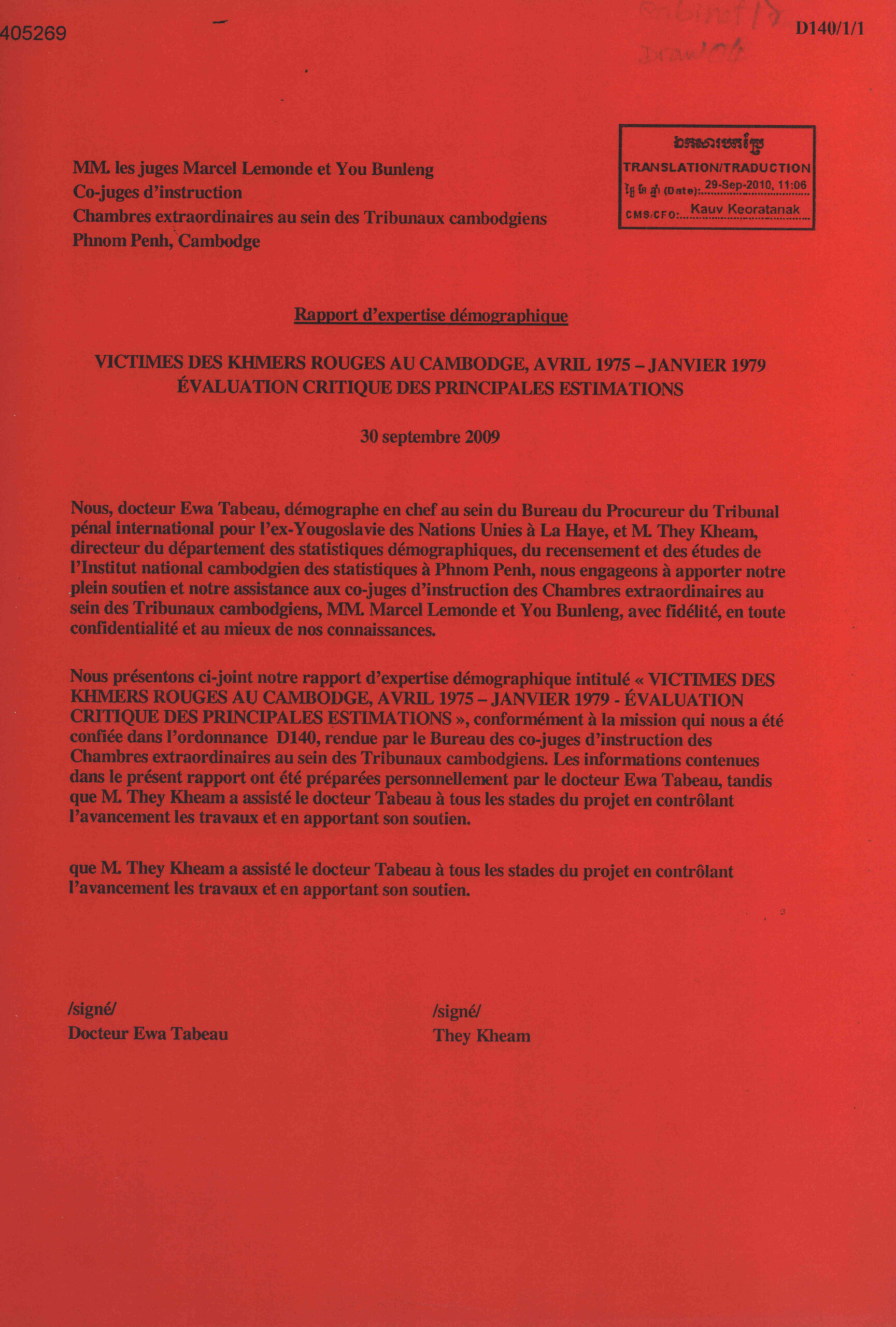Rapport d’expertise demographique: Victimes des khmer Rouges au Cambodge, Avril 1975-Janvier 1979 Evaluation Critique des Principales Estimations.