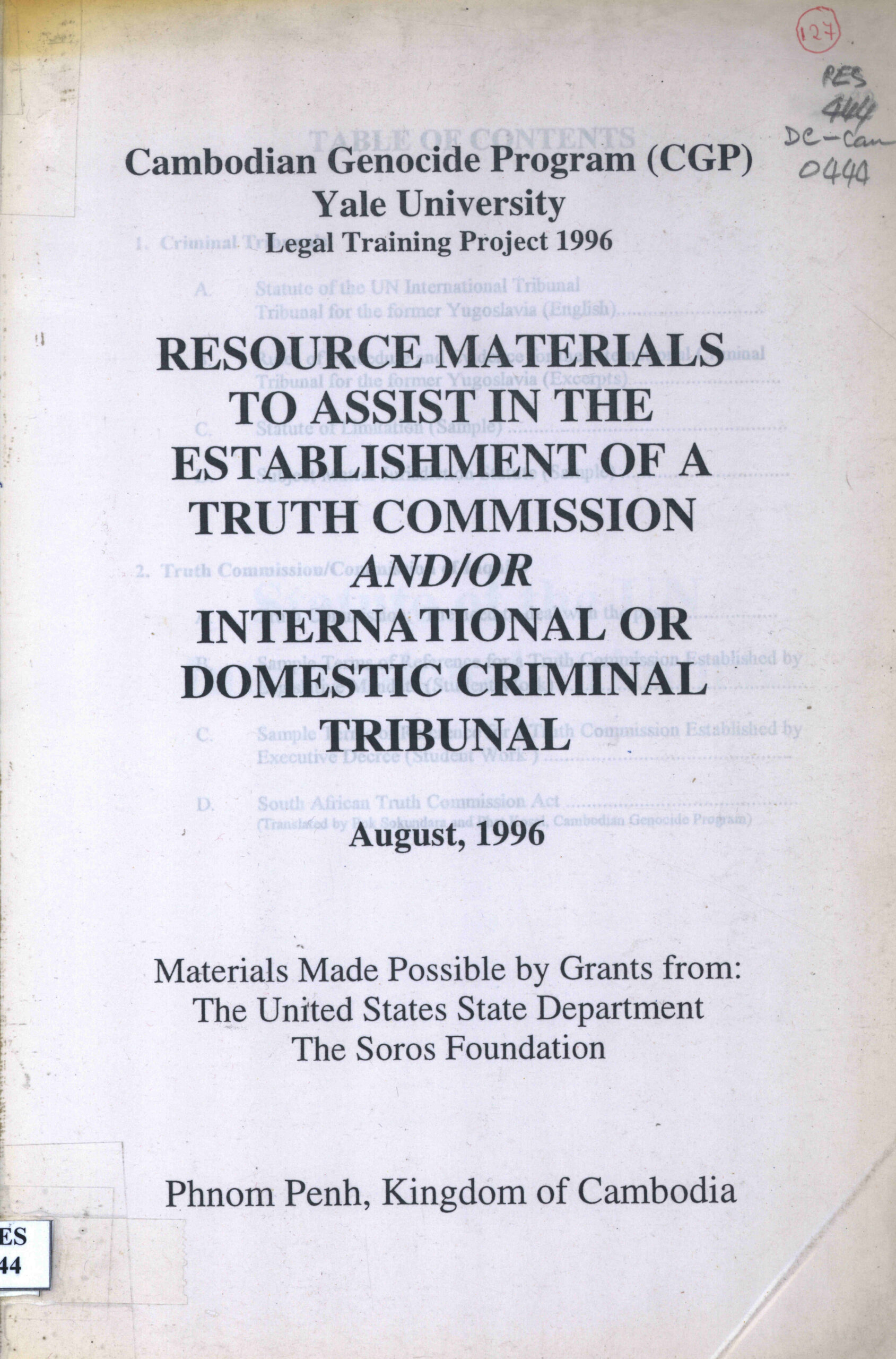 Resource Materials to Assist in the establishment of a truth commission and/or International or Domestic Criminal Tribunal, August, 1996: legal training project 1996.