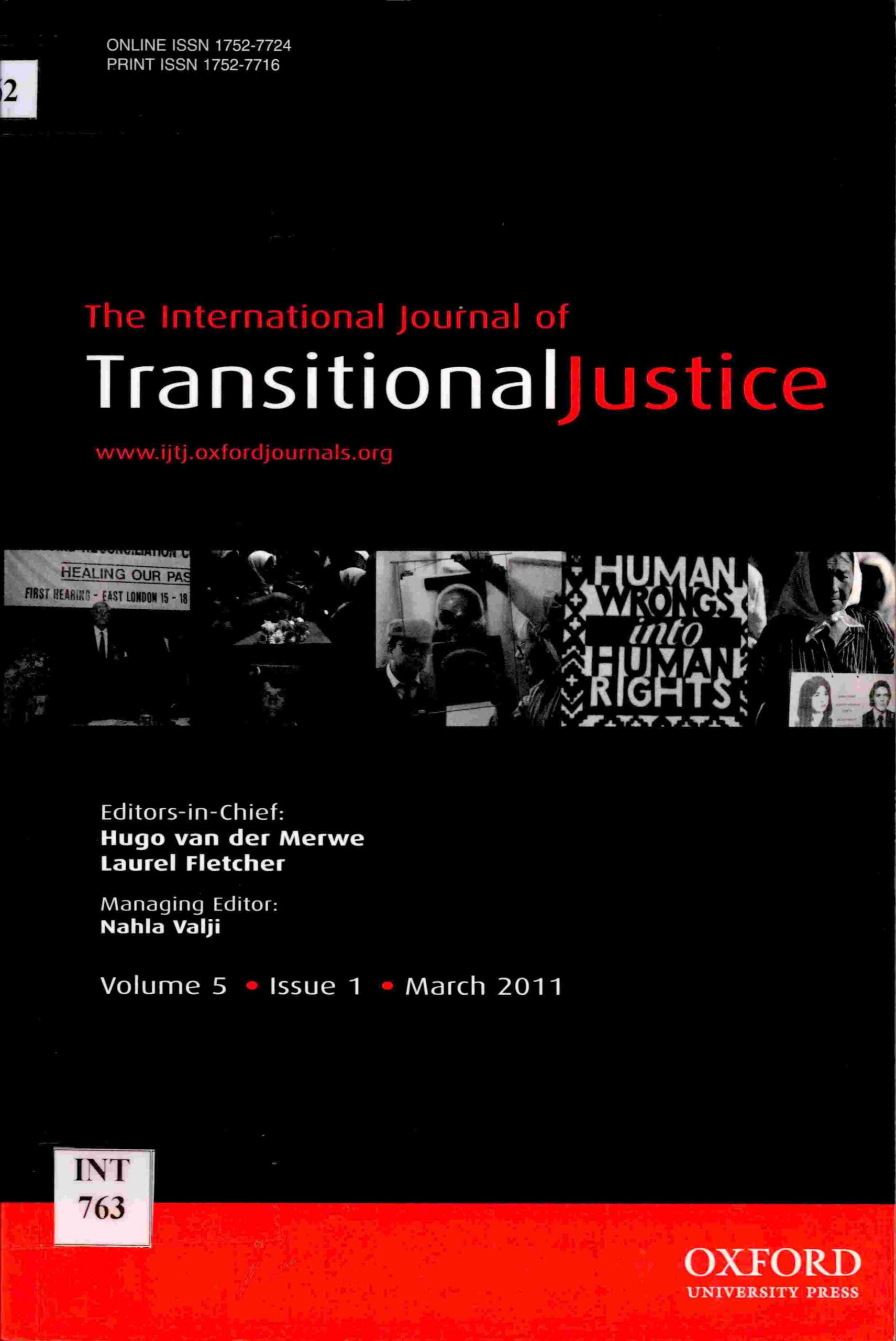 The International Journal of Transitional Justice Volume 5 Issue1 March, Issue 2 July, Issue 3 November 2011.