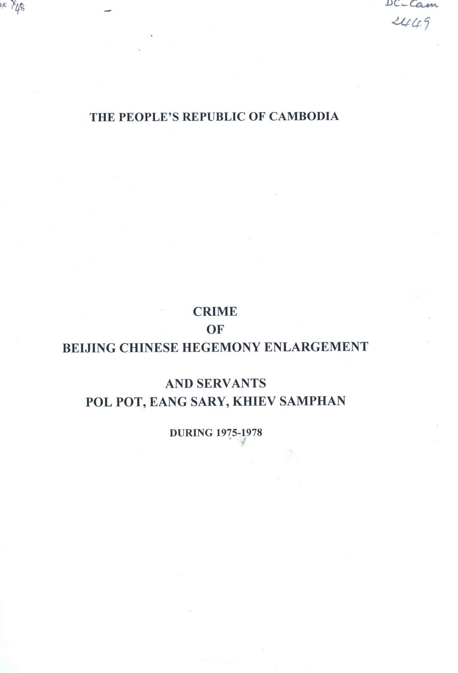 The People’s Republic of Cambodia: Crimes of Beijing Chimese Hegemony Enlargement and servants Pol Pot, Ieng Sary, Khiev Samphan during 1975-1978.