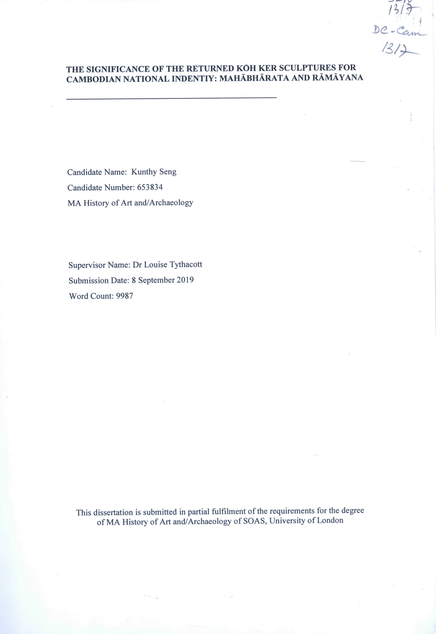 The Significance of the Returned Koh Ker Sculptures for Cambodian National Identity: Mahabharata and Ramayana: This dissertation is submitted in partial fulfillment of the requirements for the Degree of MA History of art and/ Archaeology of SOAS, University of London.