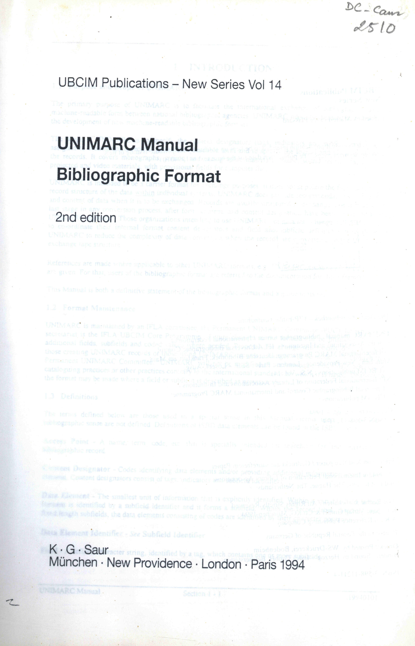 Unimarc Manual: Bibliographic Format, New Series Vol 14.